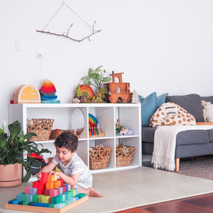 The layout of our house means I can be cooking in the kitchen, putting on a wash load or sitting down having a cuppa while my babes potter around independently playing or running around outdoors. That being said, when we first moved houses last year, it was manic, unorganised and my main focus was to make the transition smooth for the kids and our home feel like a playful, fun place - i.e one massive playroom! Well, the transition went amazingly but I was left feeling like we were living in a daycare centre (and not a pretty one at that)! So I started to daydream how to tweak our playful living space to be somewhere that I would enjoy too.